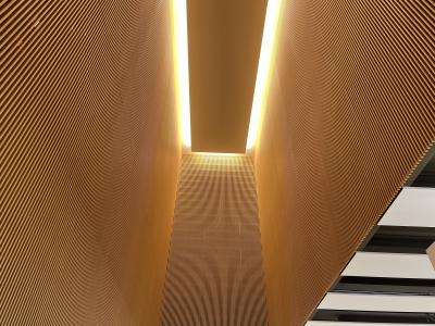 上の写真は岡山ショールームの階段上の天井の様子。岡山ショールームは