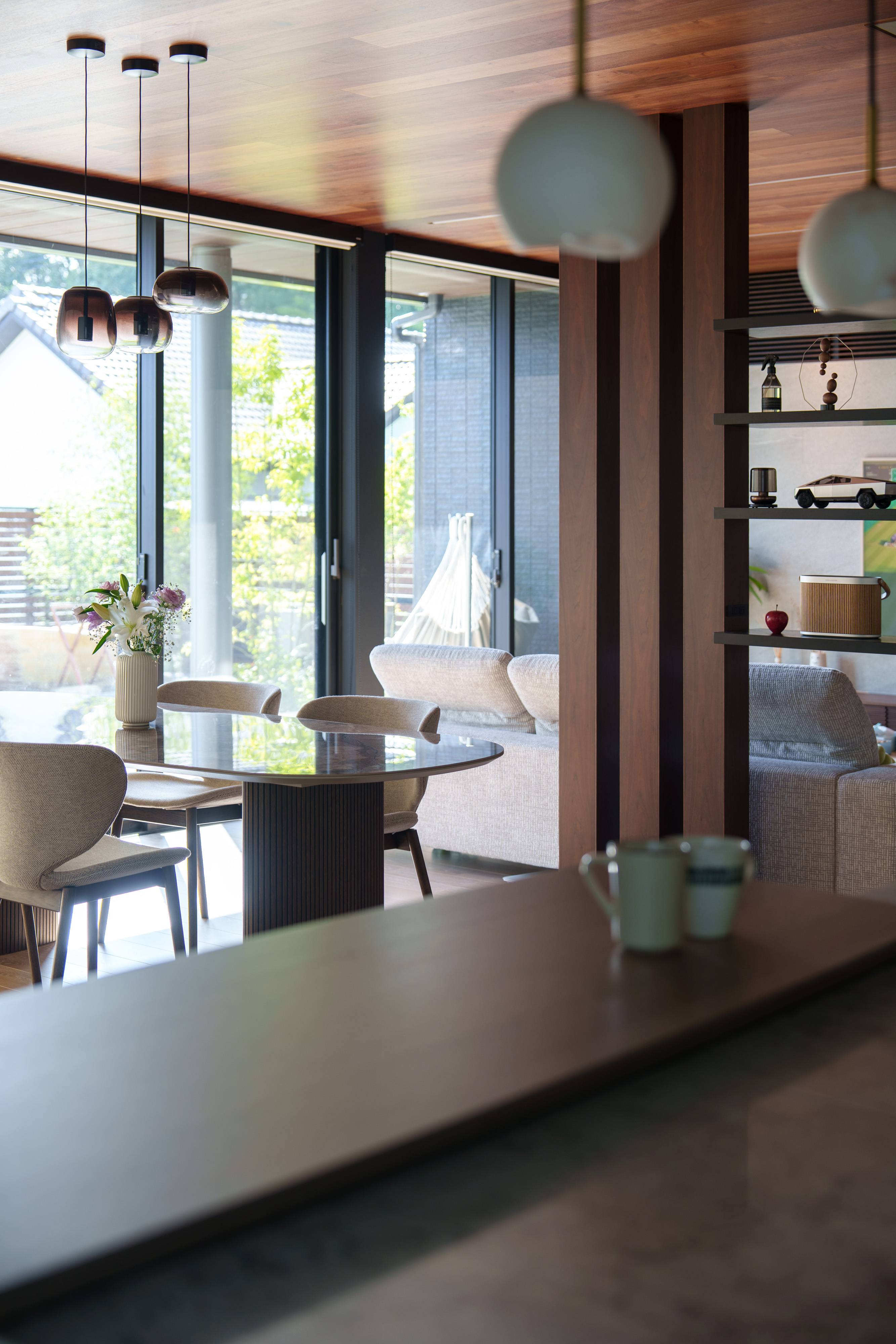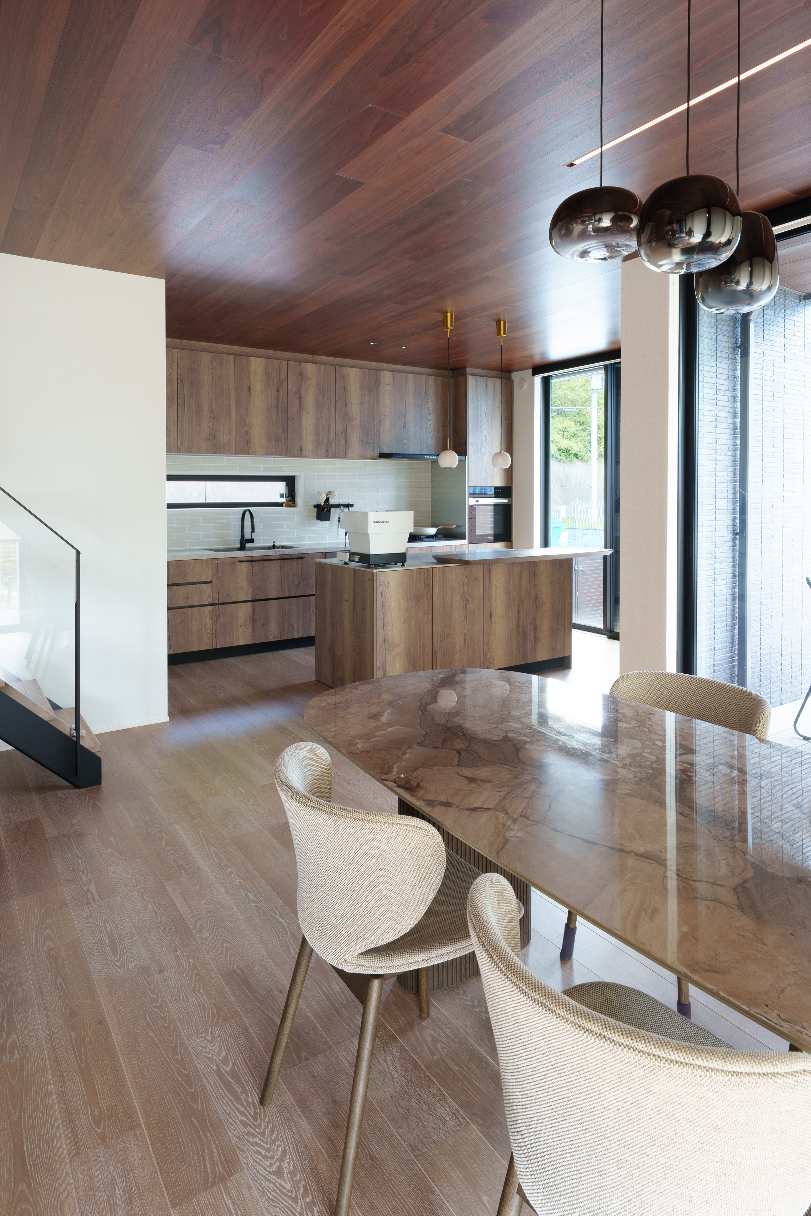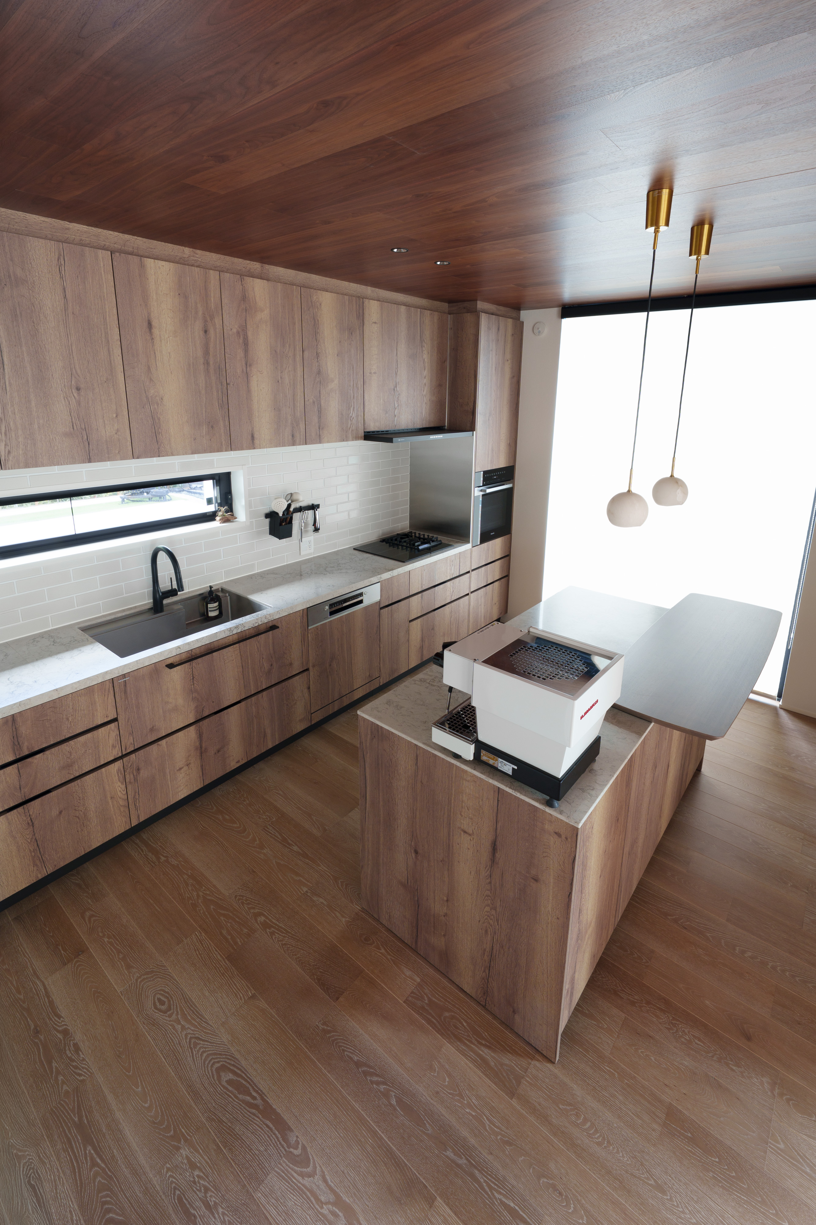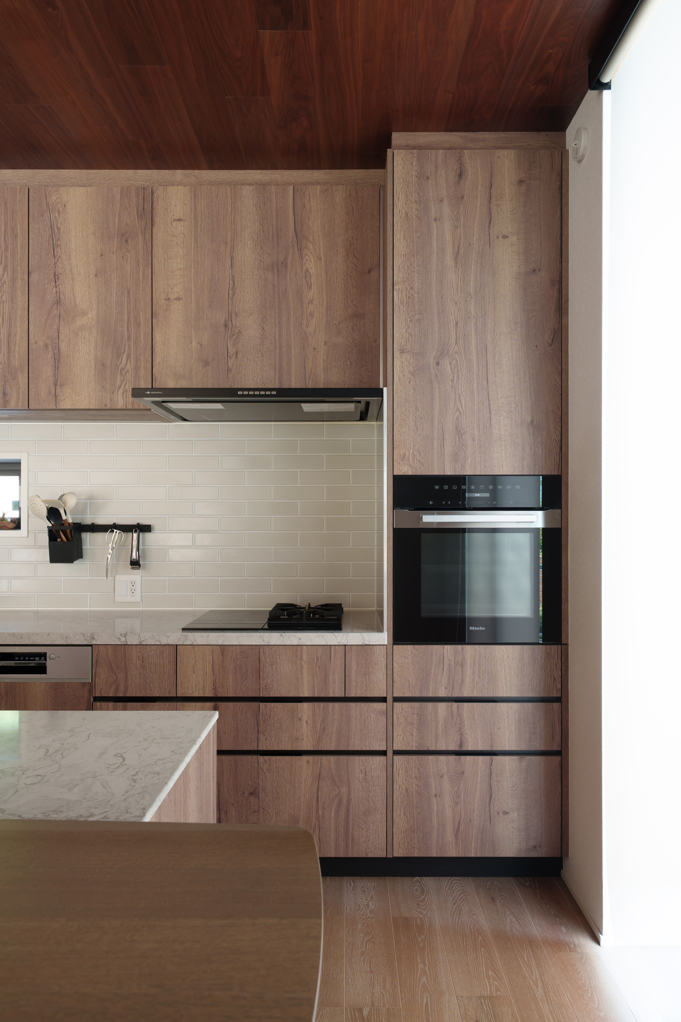 温かな木目が広がる室内に溶け込む、家具のようなキッチン。