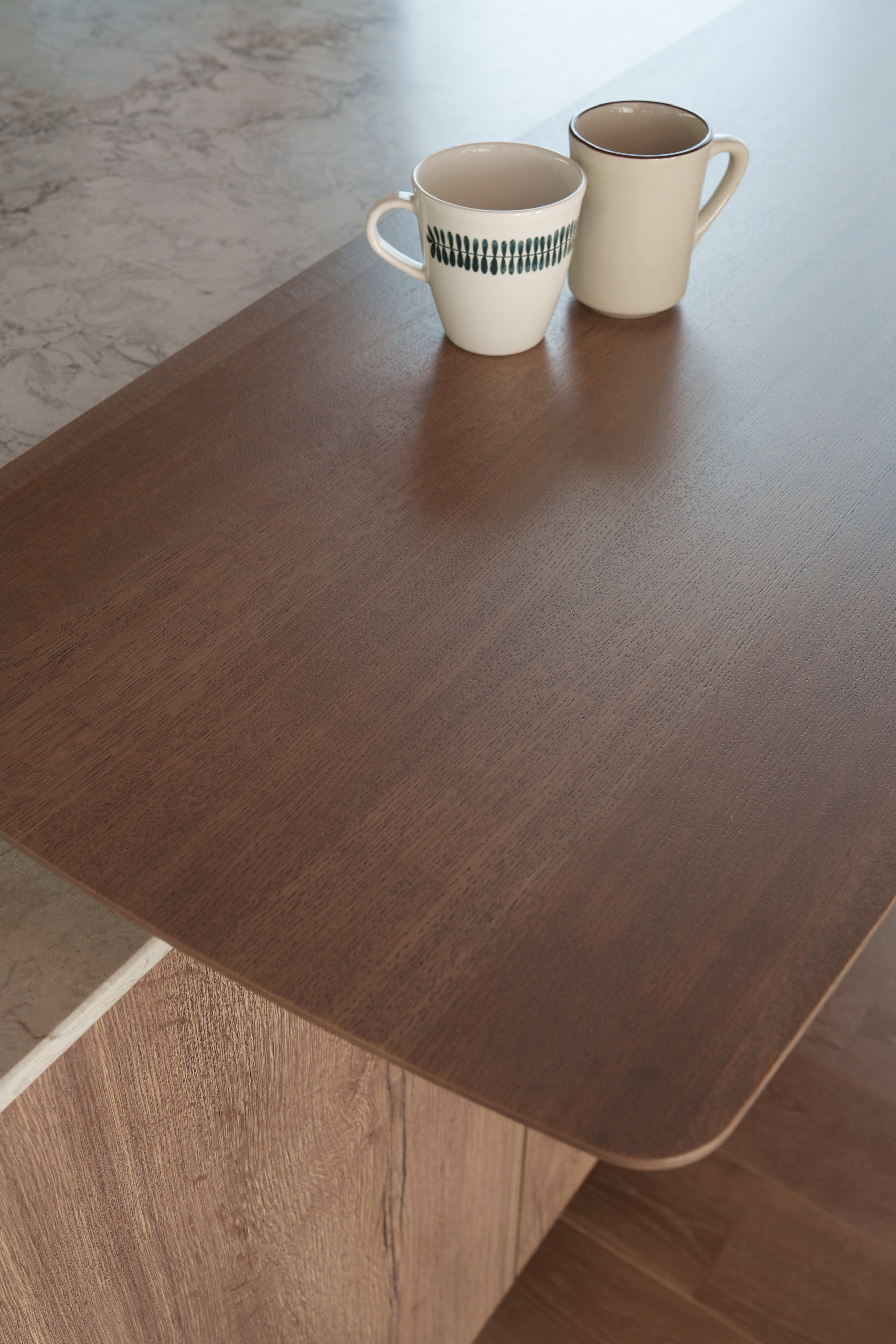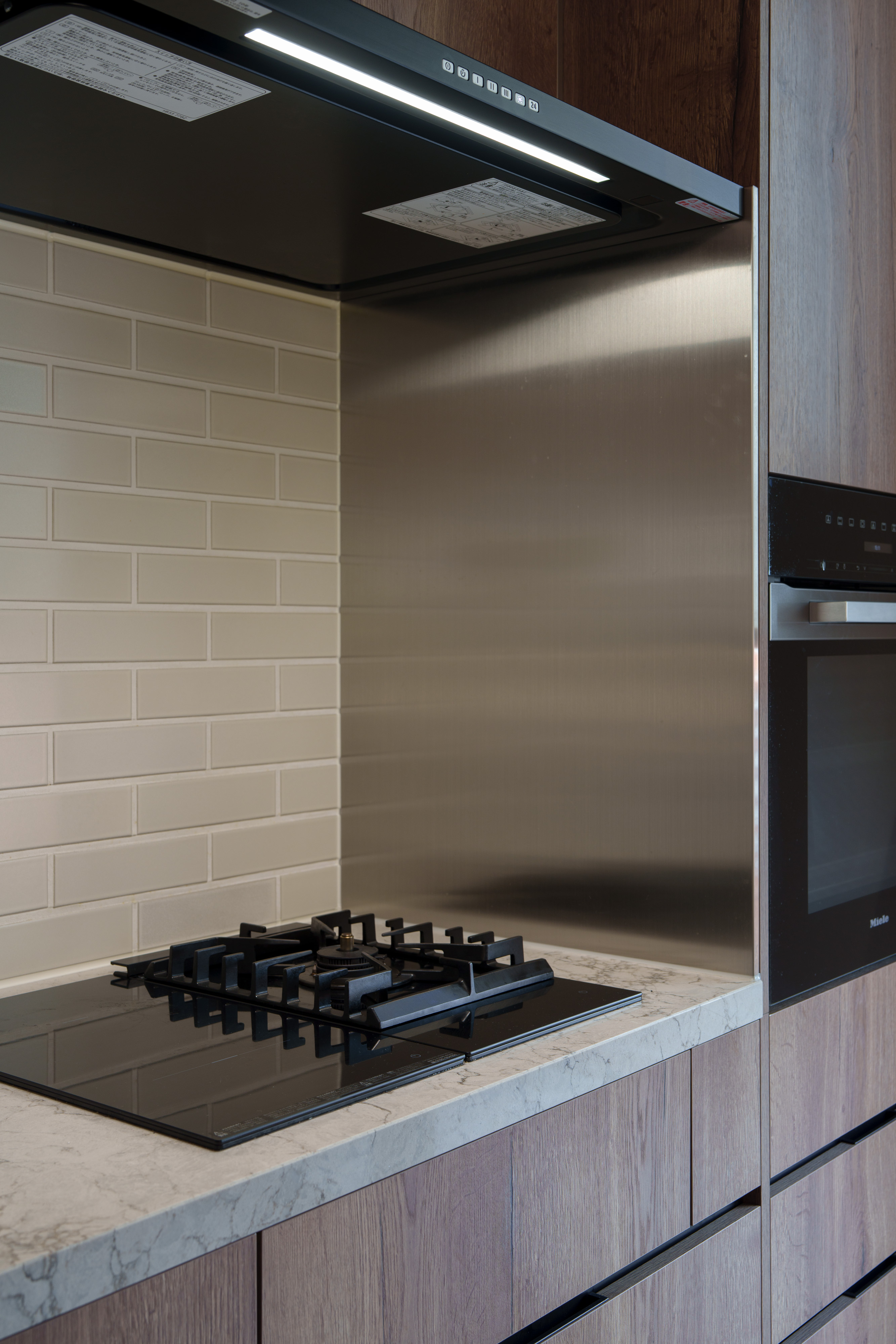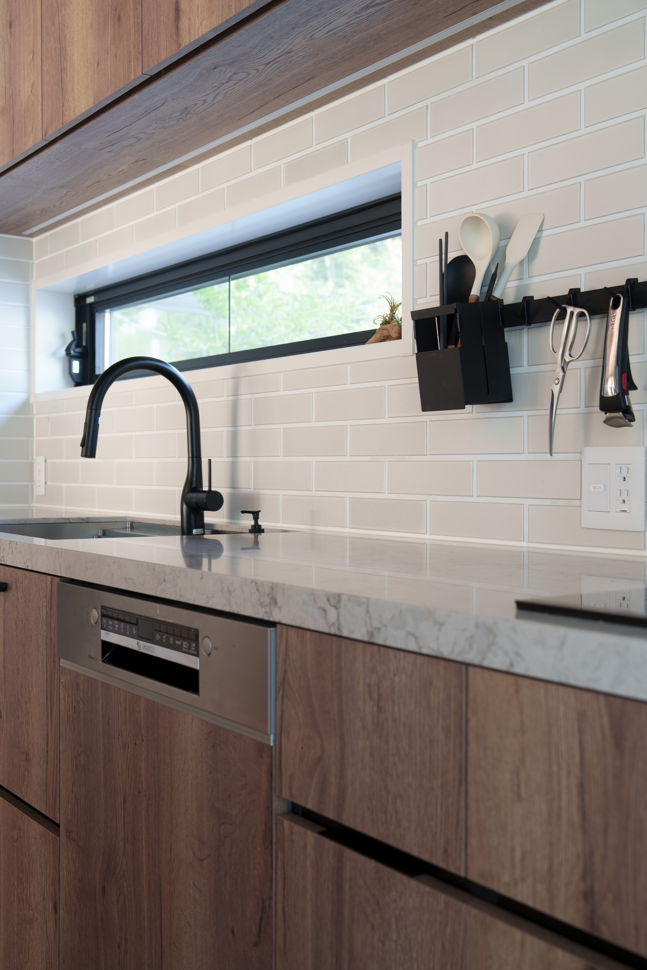 ワークトップには木目と相性の良い上品な模様のクォーツストーンを採用し、その上に丸みを帯びたボートシェイプカウンターを設置。