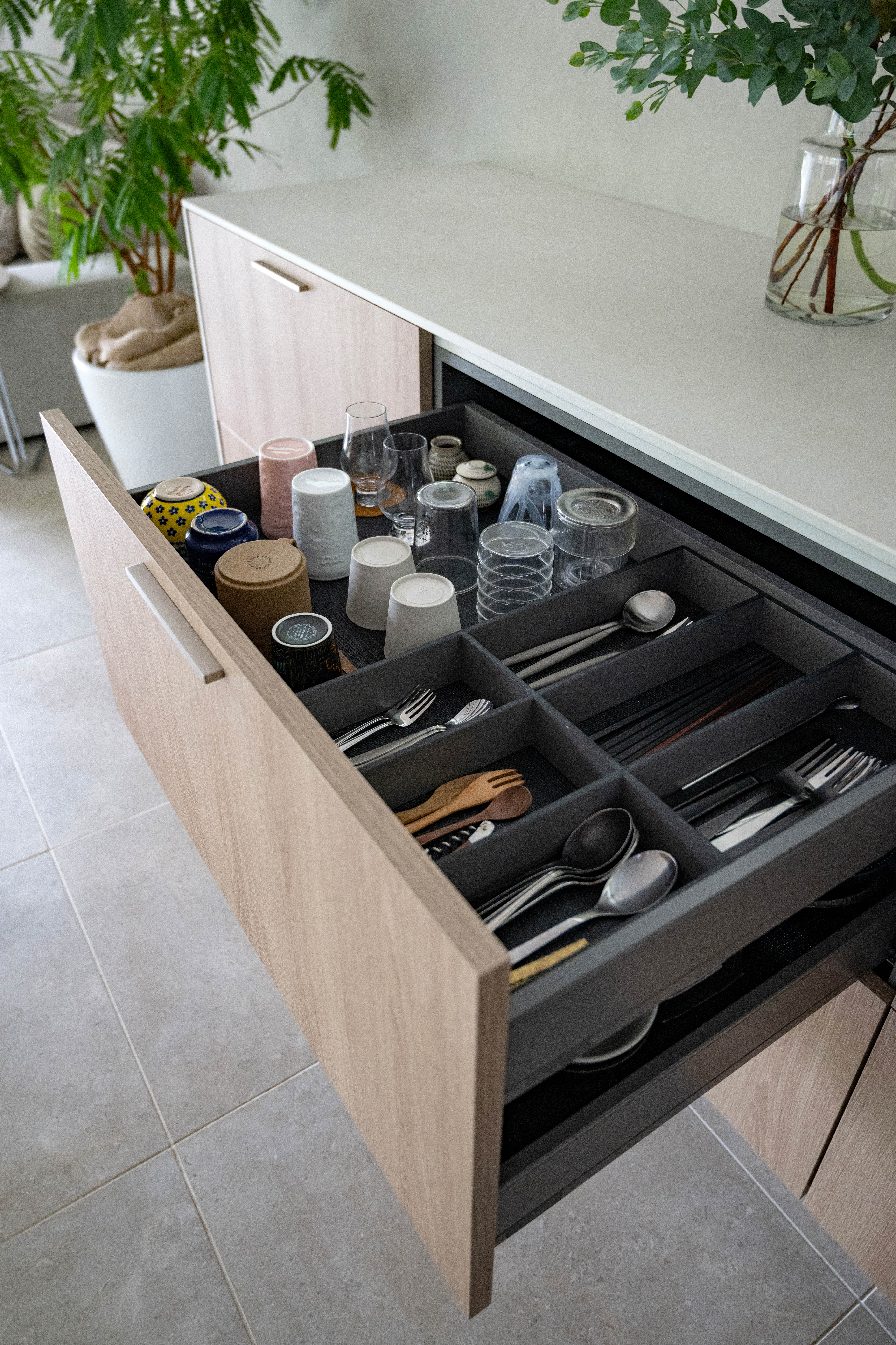 収納スペースには、立ててしまいがちなレードルや菜箸、トレイ類もすっきりと引き出し内へ。