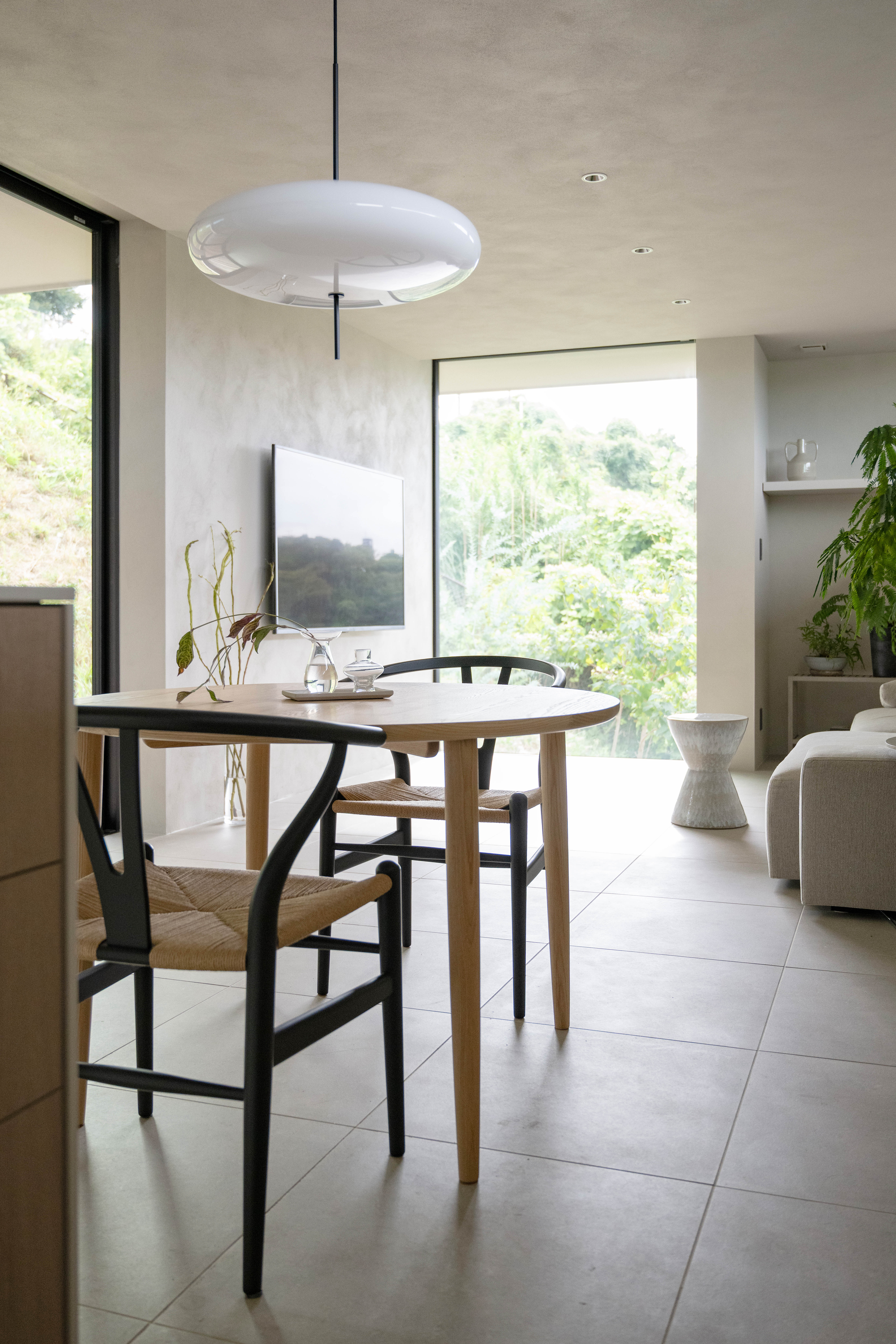 奥さまがコーディネートした丸みのある家具が、空間にやわらかなリズムを添えています。