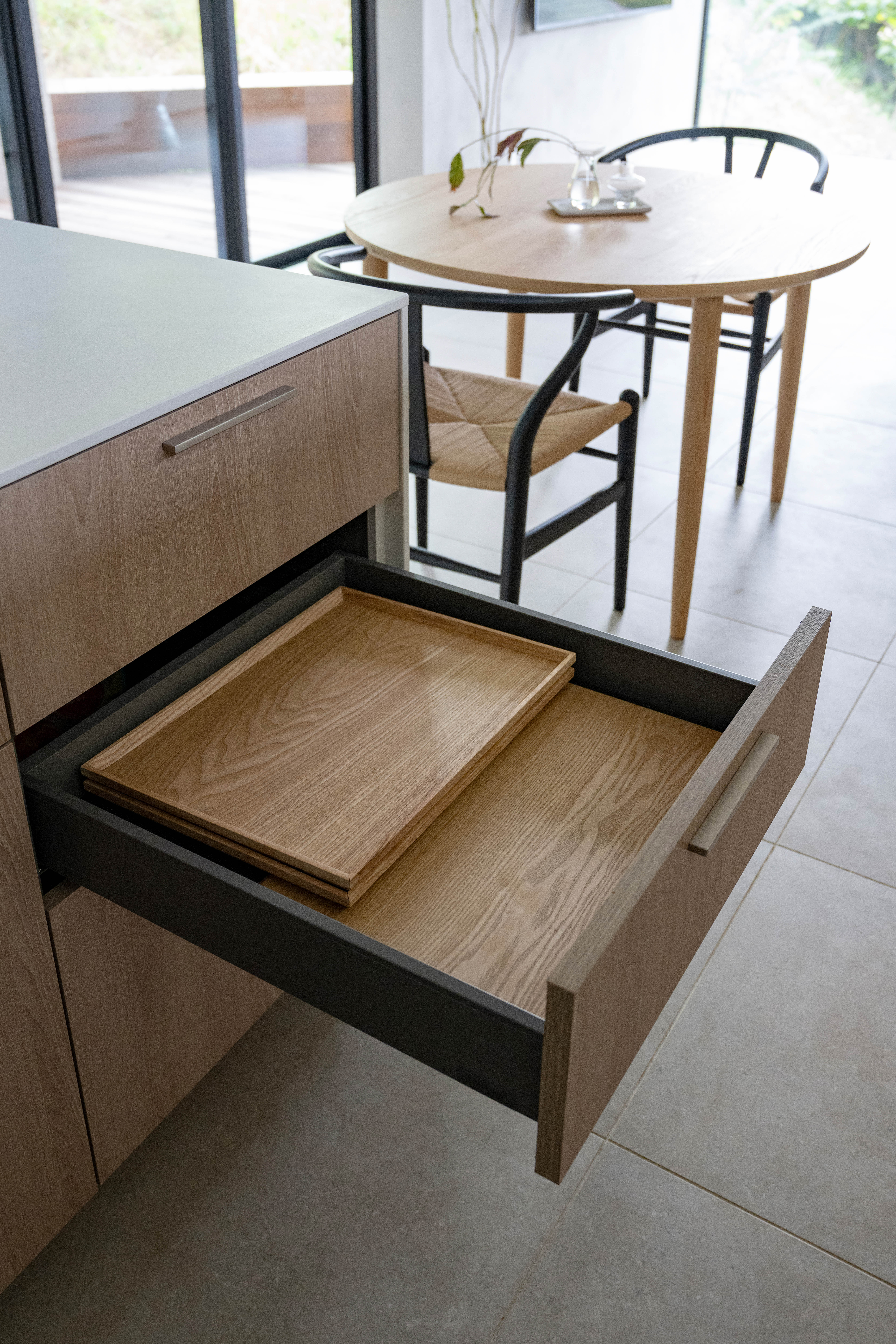 形の異なる和食器も、インナードロワーを設けることでゆとりをもって収められます。