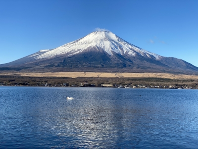 2024年の元旦の富士山、湖に点に見える白いものが白鳥です。