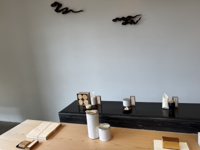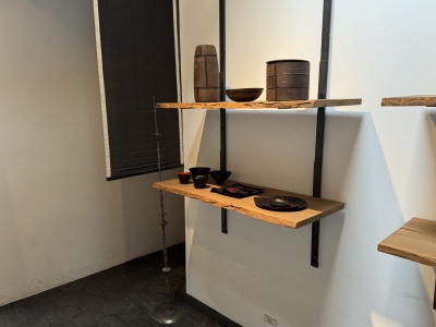 東山の什器が展示されています。’WASARA’(簡易な紙で出来たお皿)