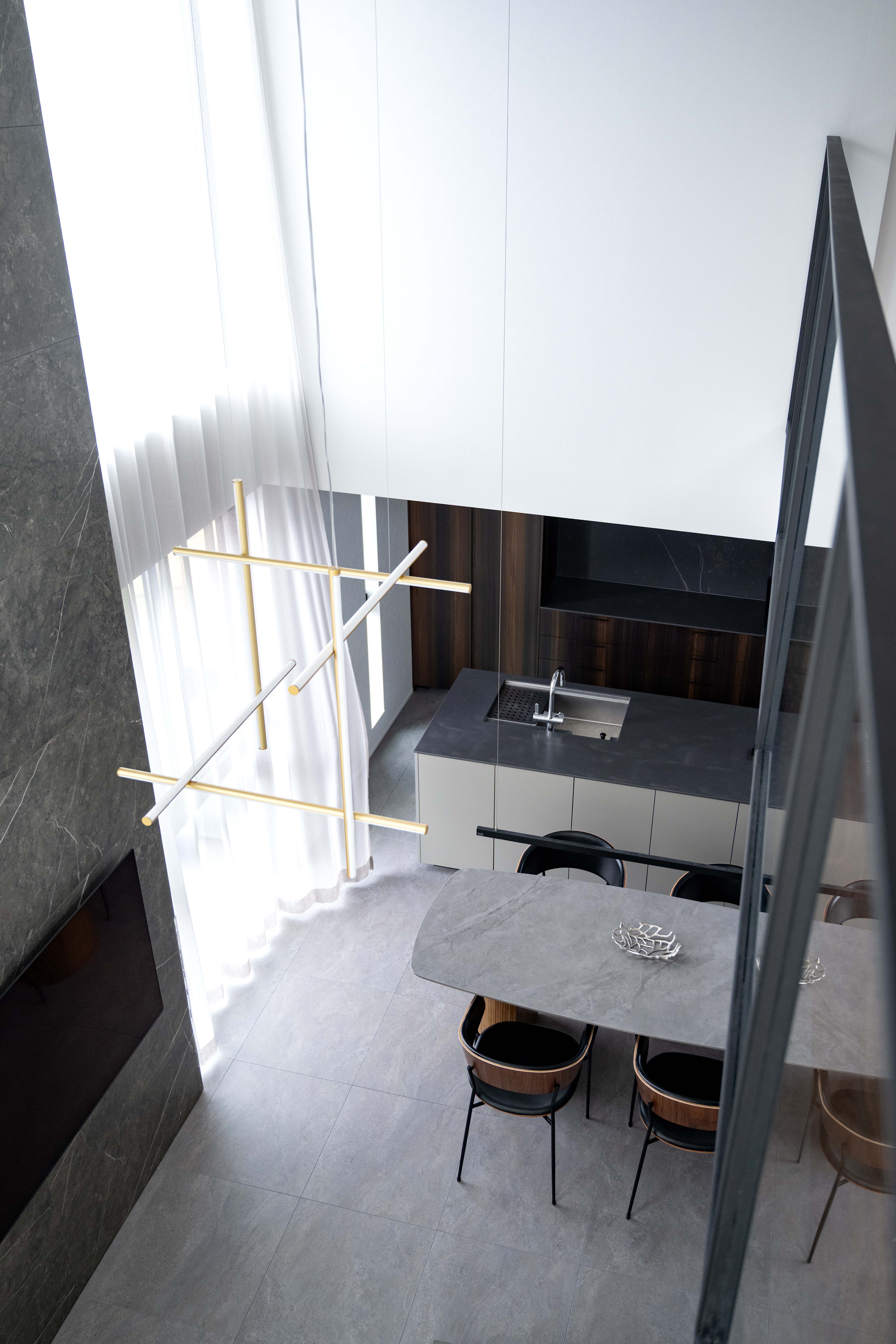 キッチンに立つと、吹き抜けの上階まで視線が抜け、