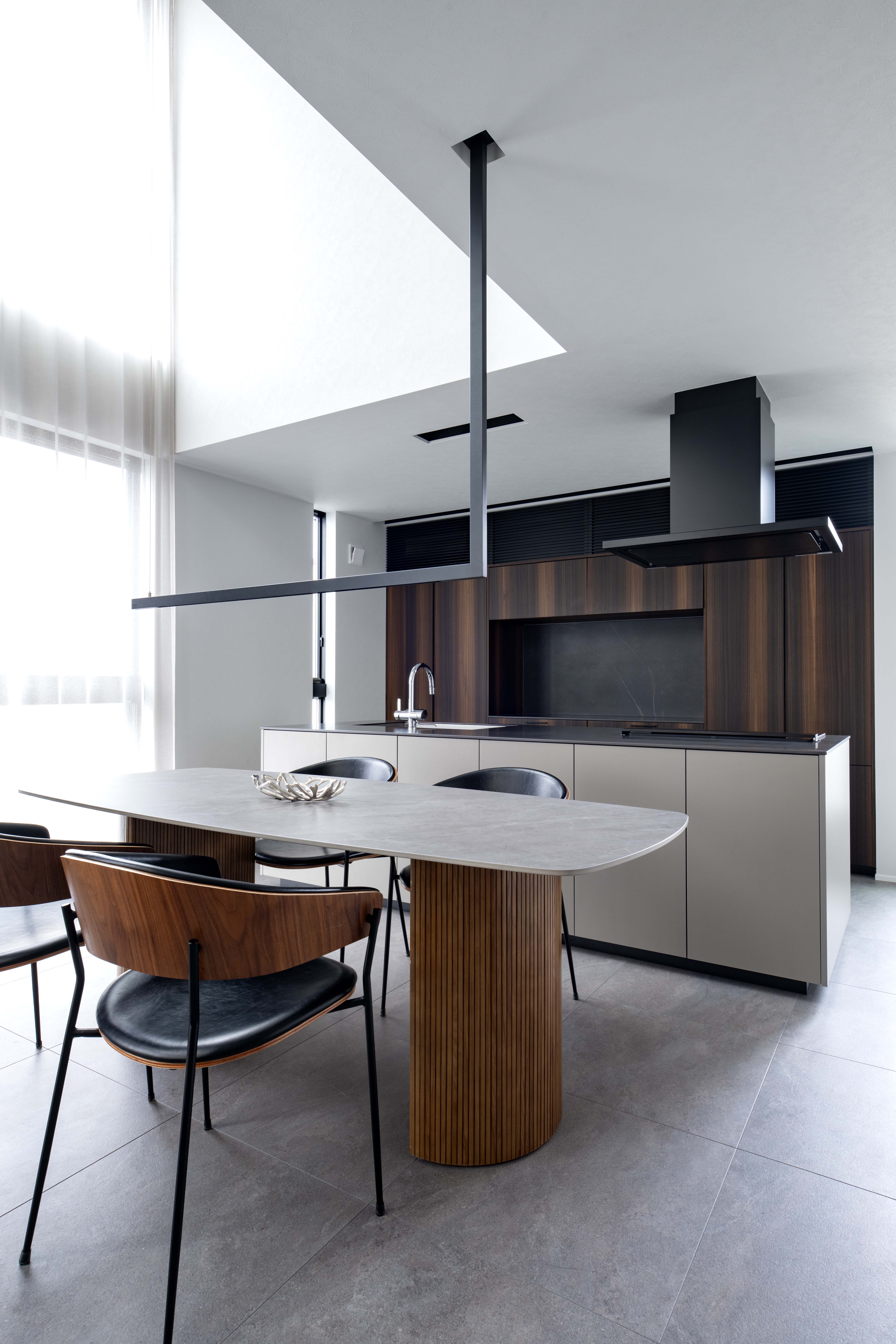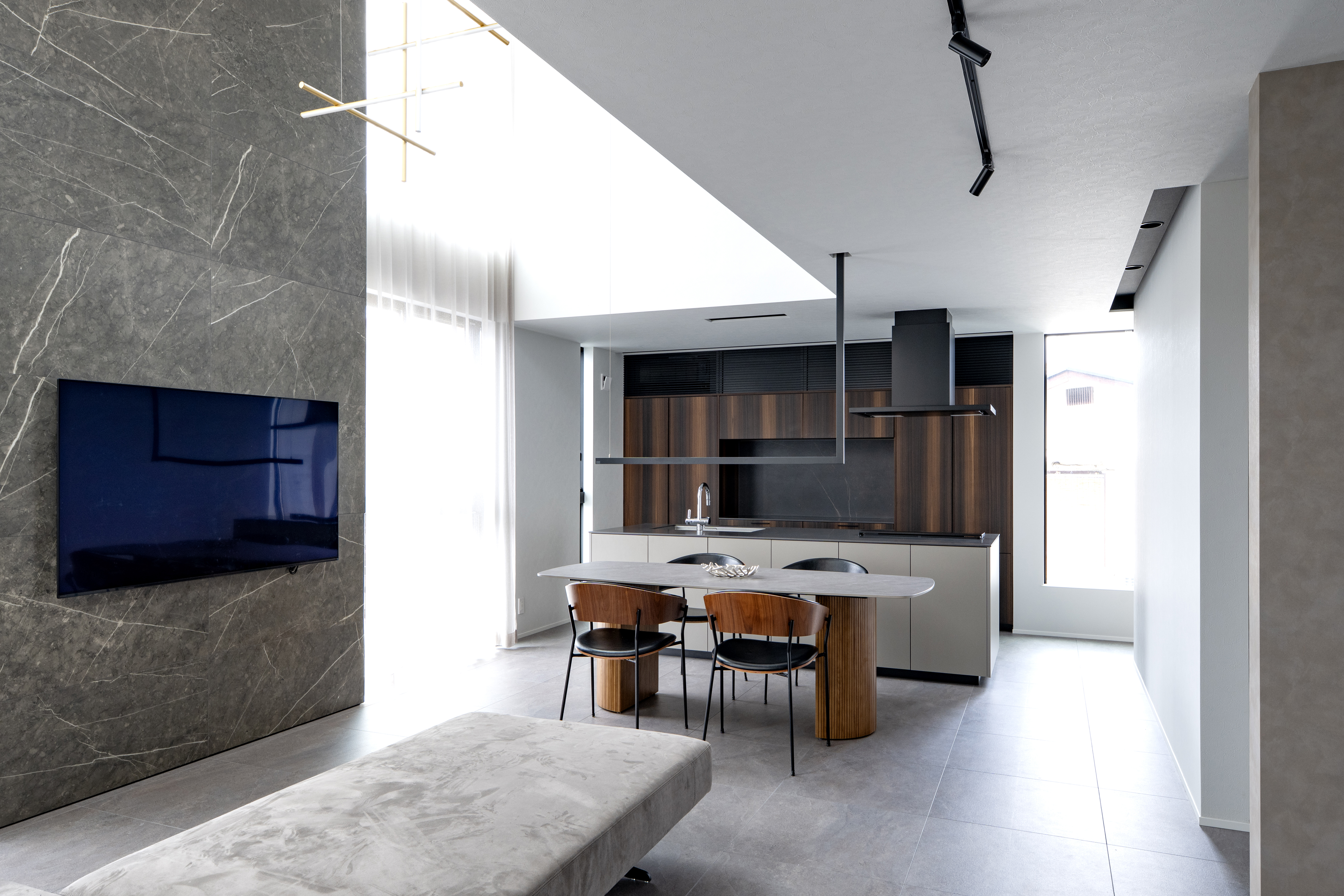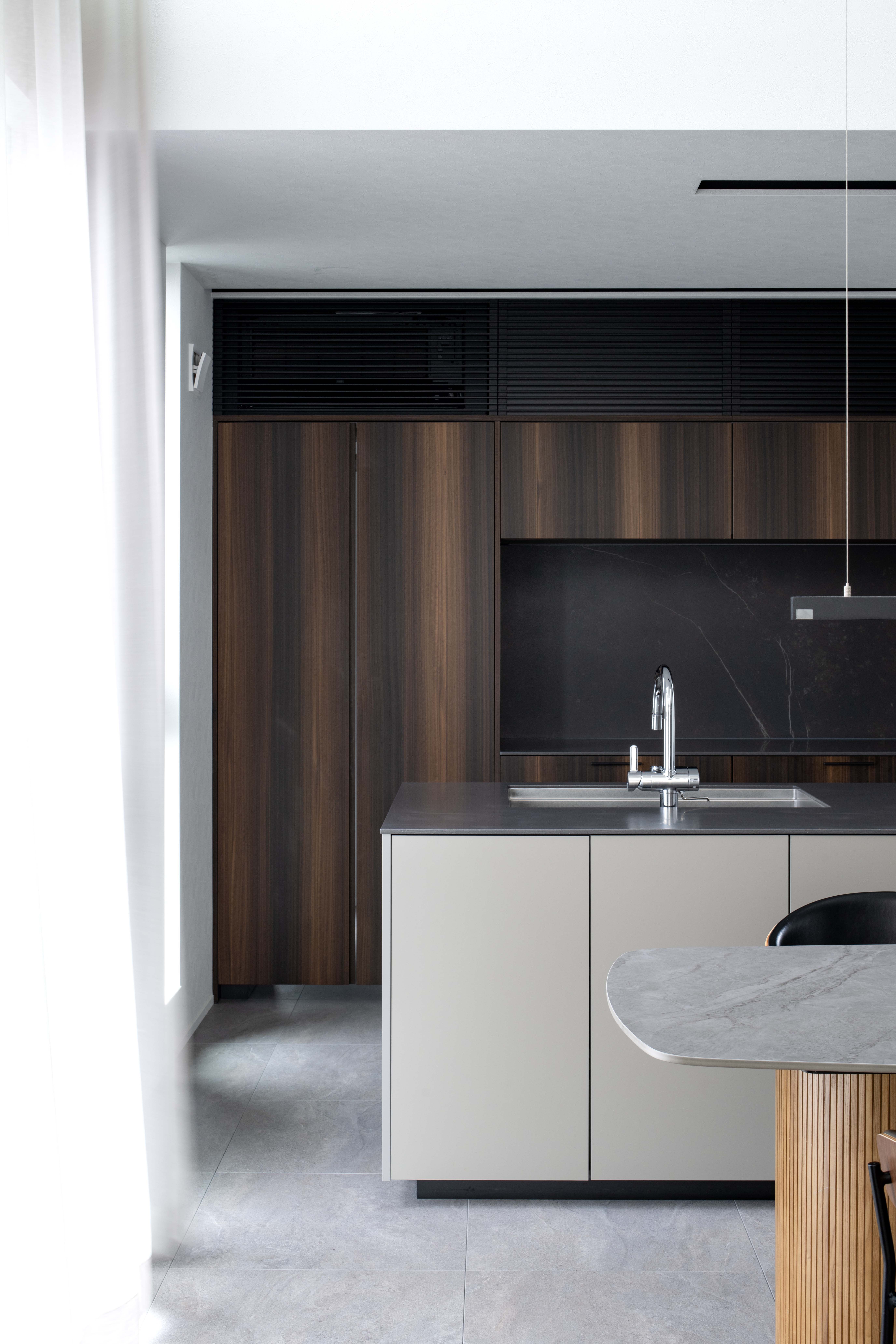 フュームドユーカリの奥行きある木目と、石調の静けさが重なり、
