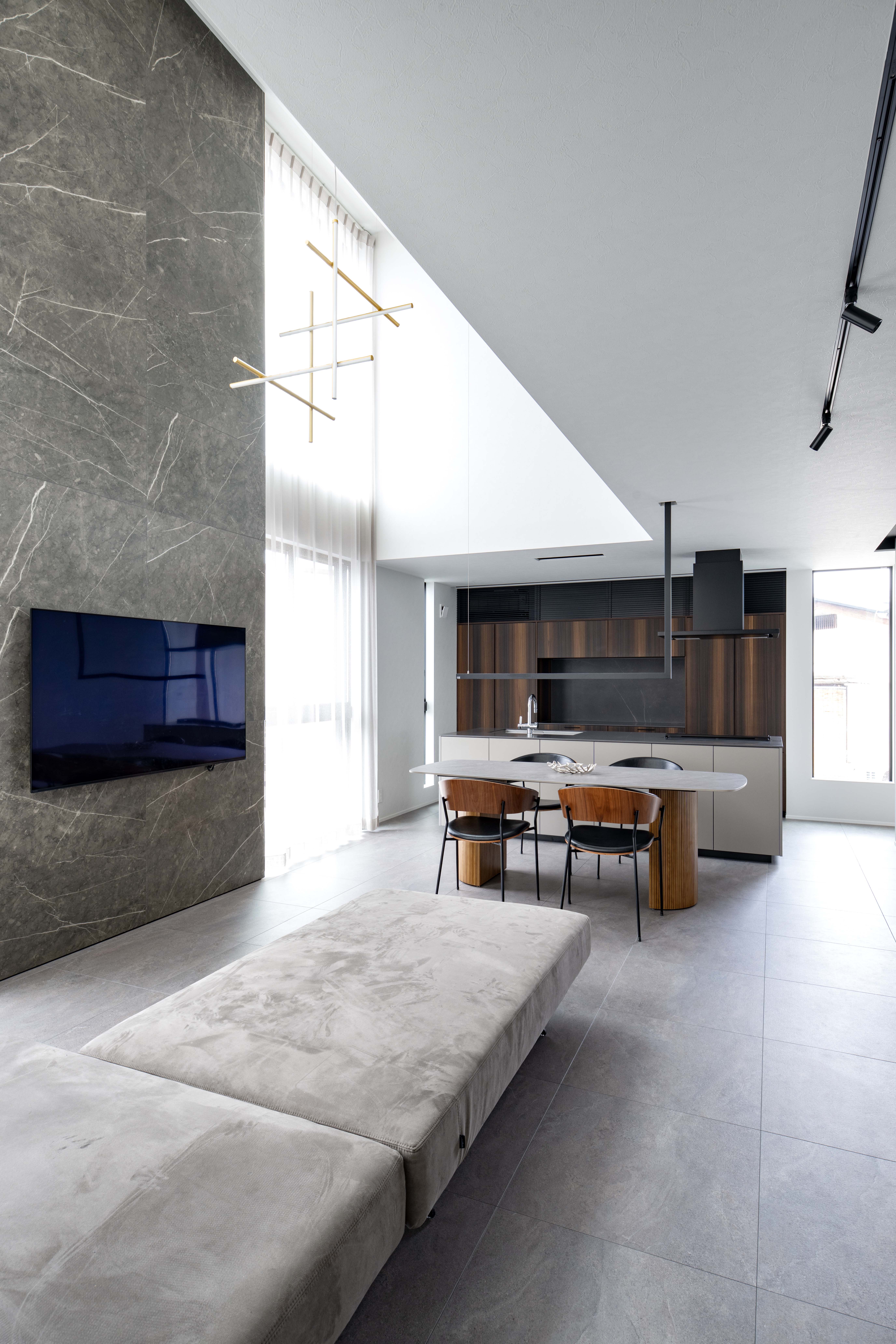 リビングや上のフロアで過ごす子どもたちの気配も感じられる、ひと続きのLDK空間。