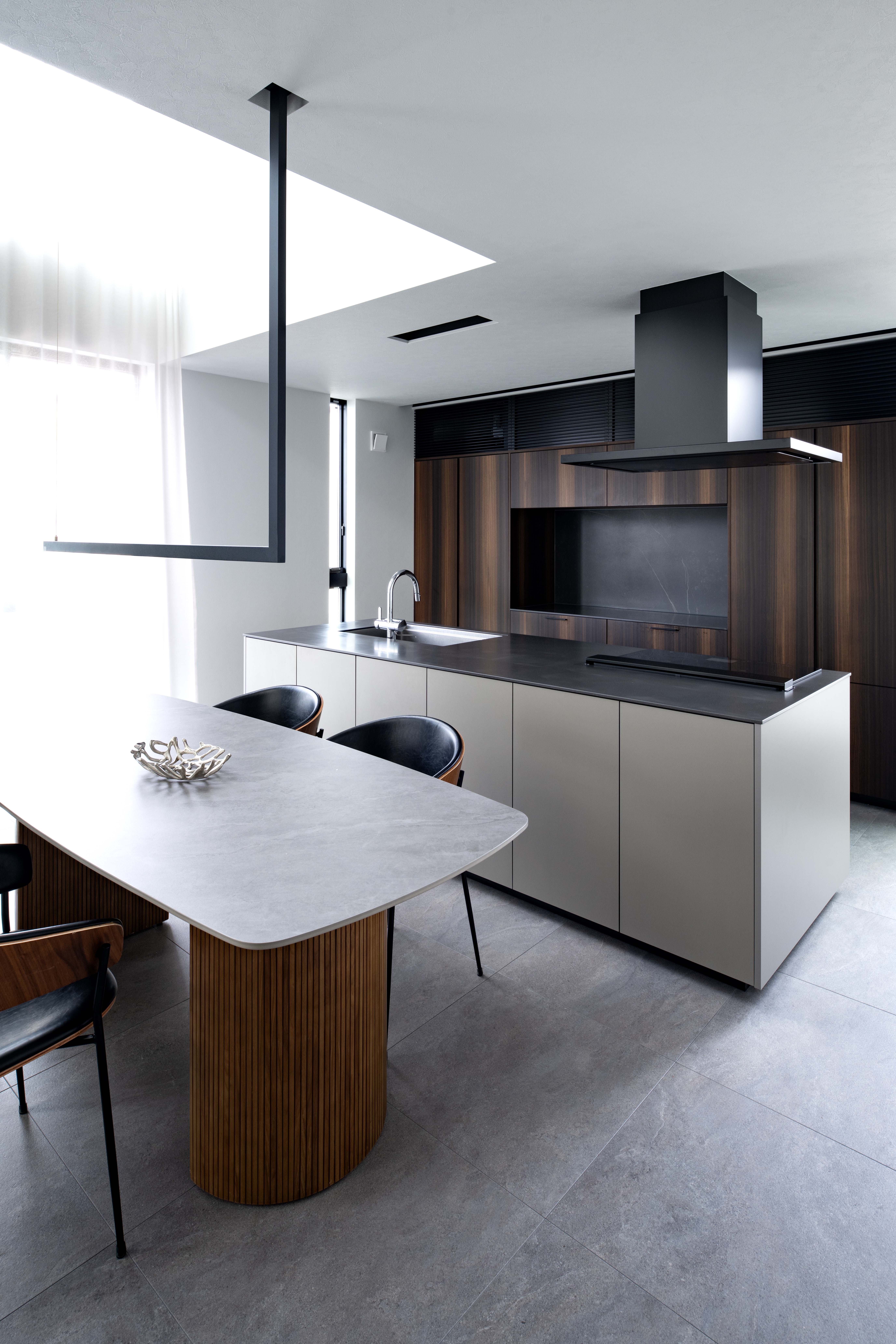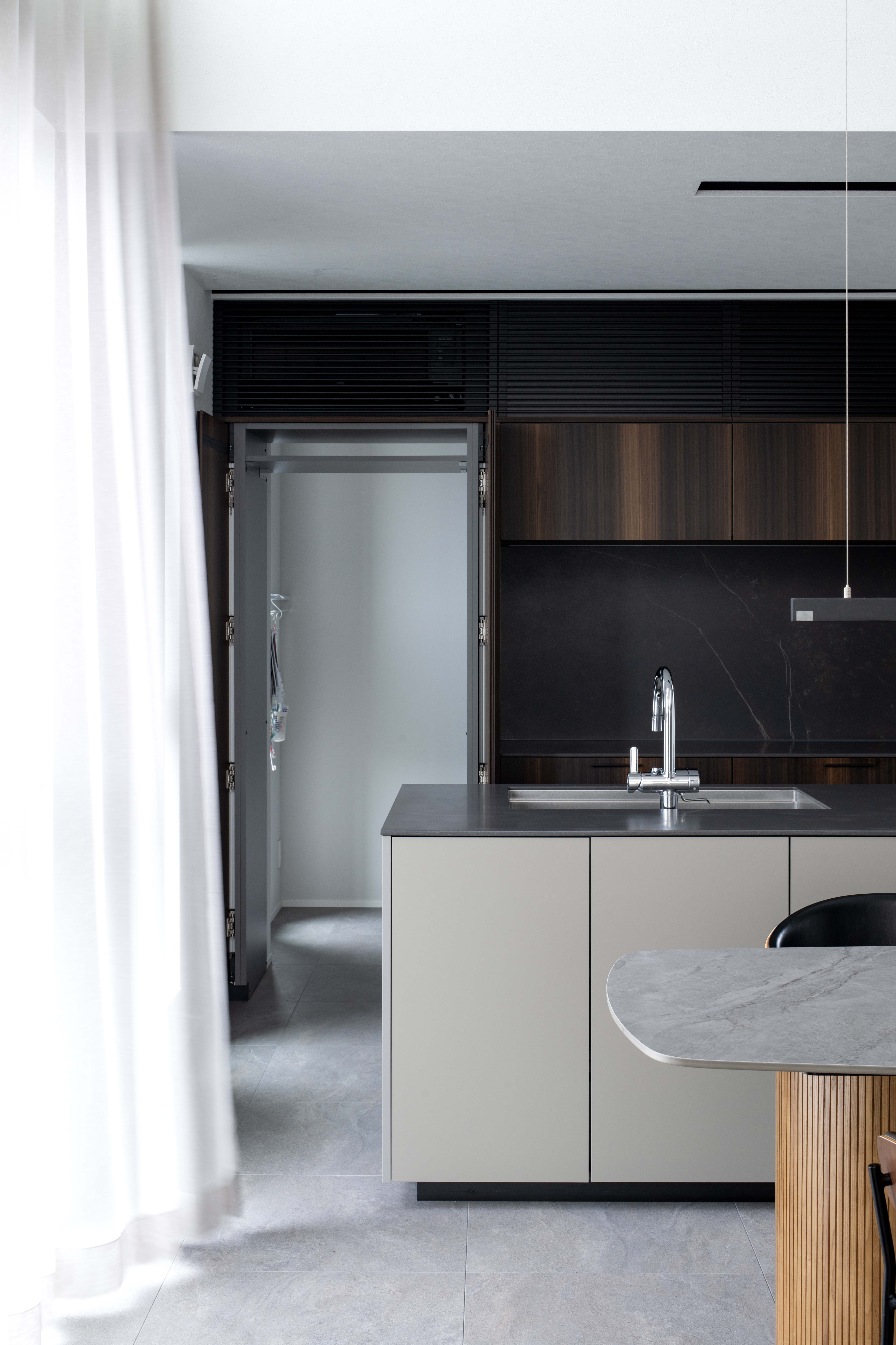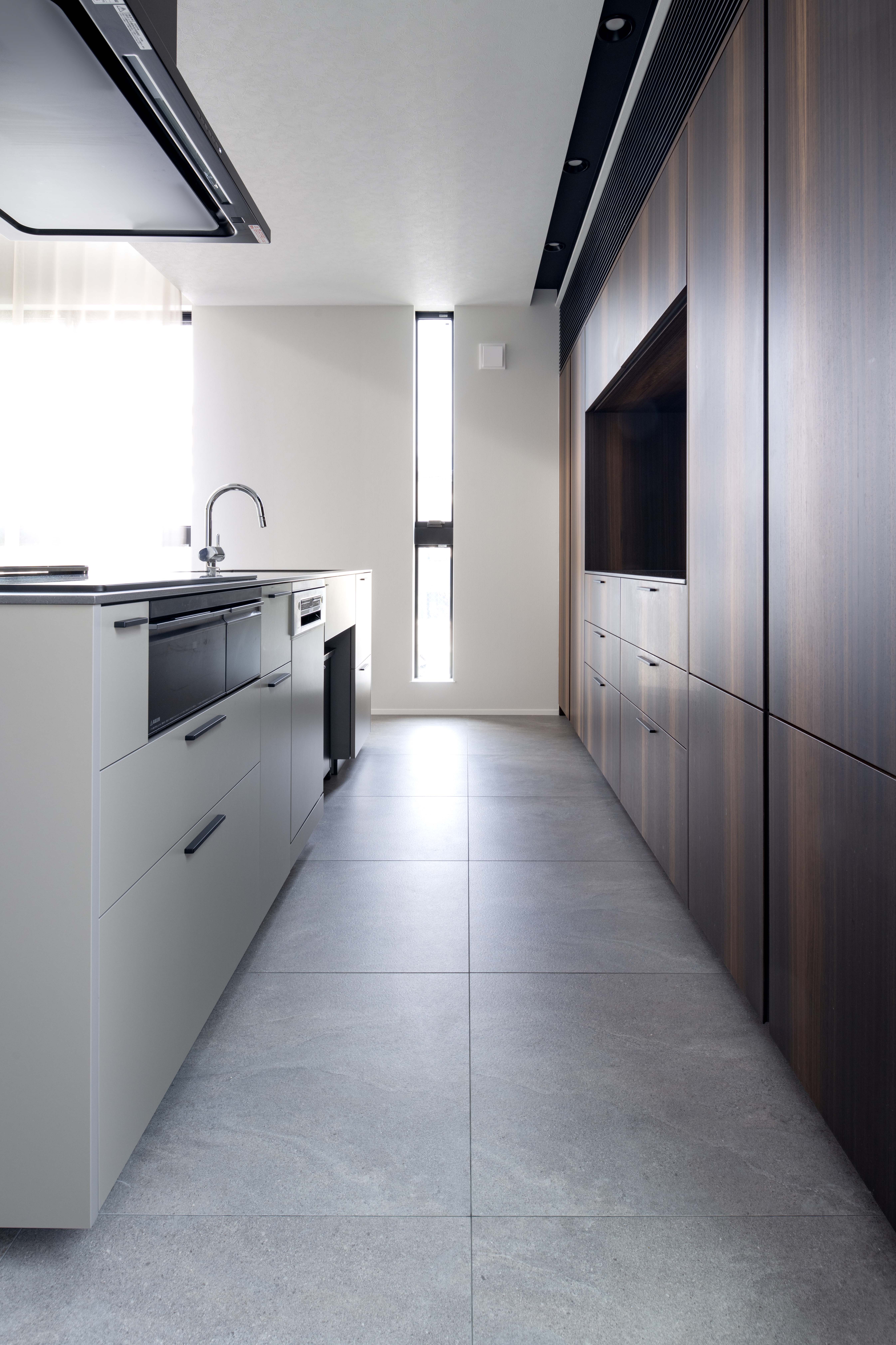 深みある墨色を思わせるコーリアン〈スミグレー〉を合わせたアイランドキッチン。